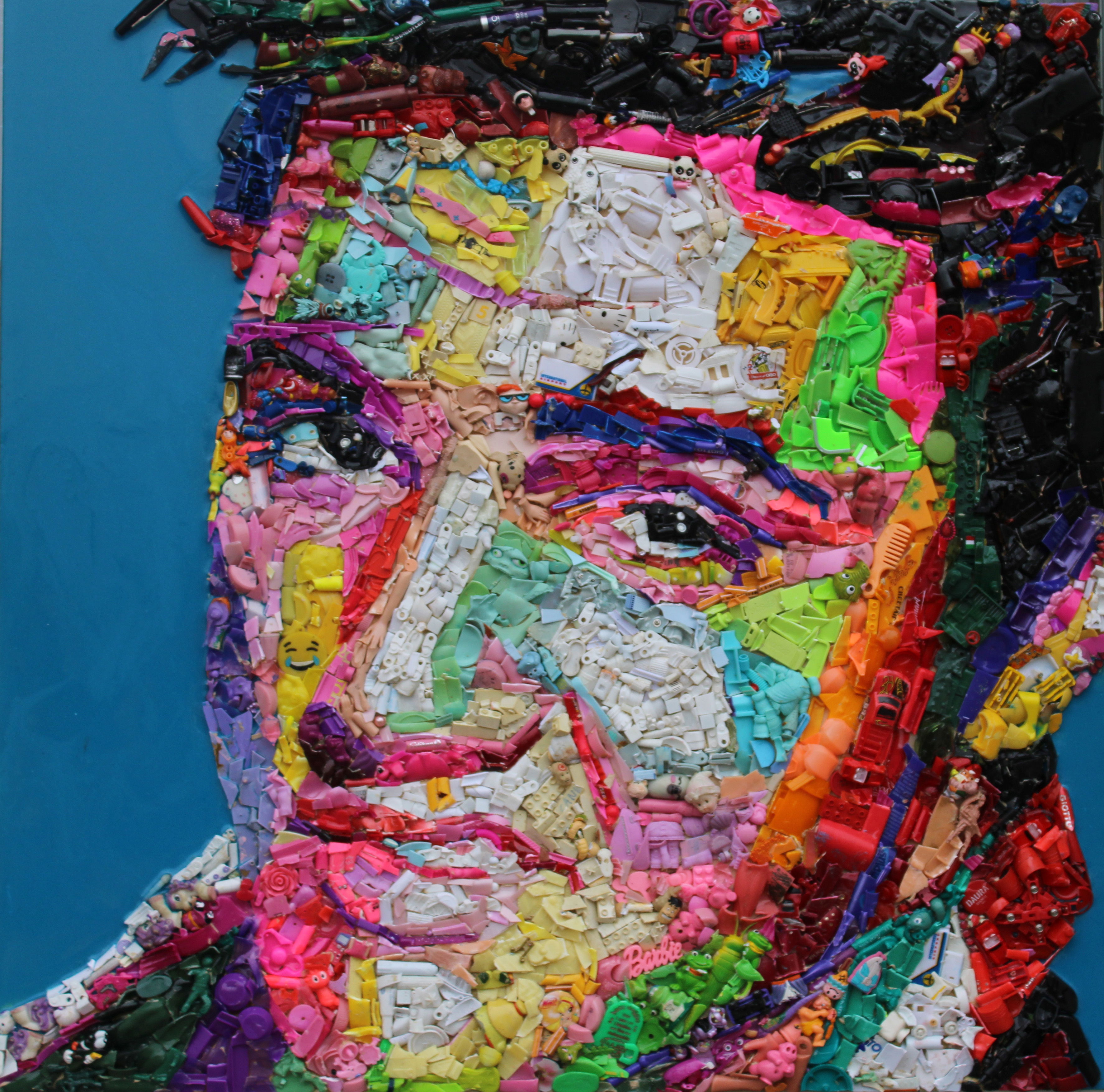 Eco mosaico realizzato in oggetti di plastica di recupero su tavola lignea- Un'opera coloratissima, ispirata alla WPAP, pop art, che ritrae con la tecnica sostenibile di Lady Be Elvis Presley, il Re del Rock che aveva espresso al Presidente degli stati uniti il desiderio di voler diventare agente FBI. Lady Be ha voluto catturare con la plastica il mistero del suo sguardo.